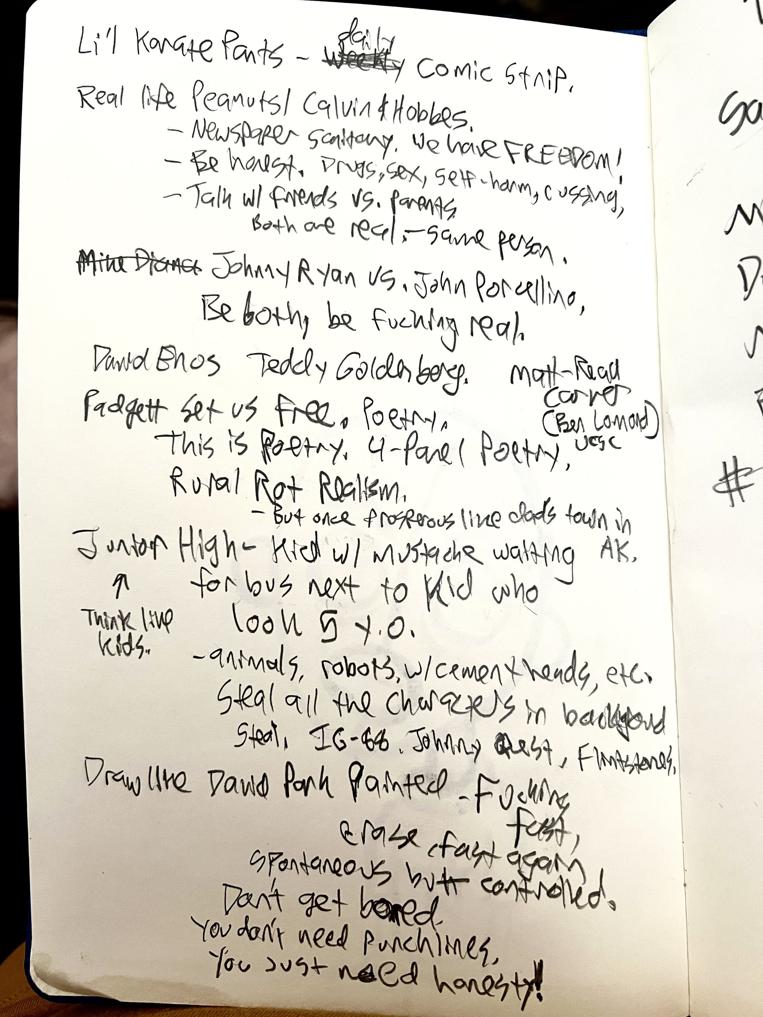 If, after all that, you’re still wondering what the hell I’m doing here, this might help. A few weeks after the strip started, I wrote a little note to myself in my sketchbook. It was meant as a kind of loose bible, just something to shore up my thinking and remind me what I was aiming for. Most of it still feels true to the strip today: